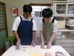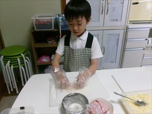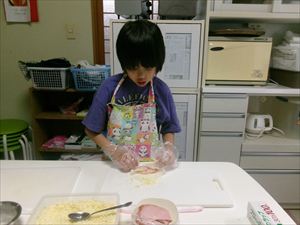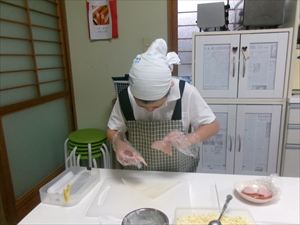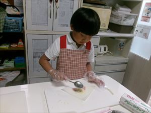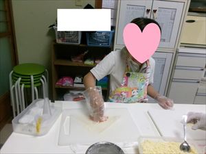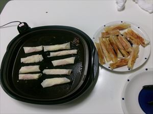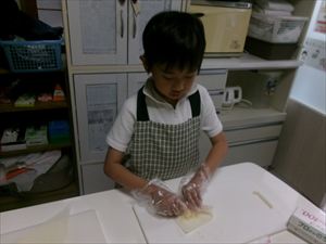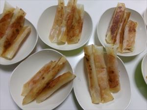 春巻きの皮をくるくる巻いて、水溶き小麦粉をのり代わりに塗ってとめていきます。