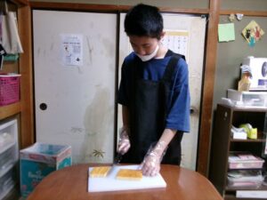 次に、カップの下に入れるスポンジケーキを一口サイズの大きさに切っていきます!