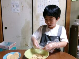 はじめに、ビスケットを手で半分の大きさに割っていきます!