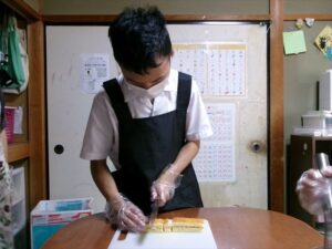 次に、カップの下に入れるスポンジケーキを一口サイズの大きさに切っていきます!
