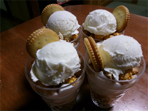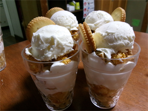 最後にカップにスポンジケーキ、生クリーム、ビスケットを入れ、