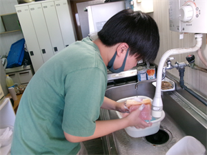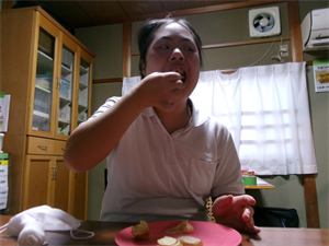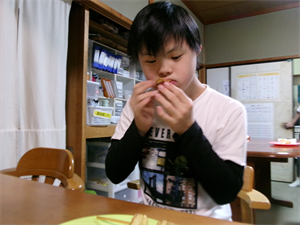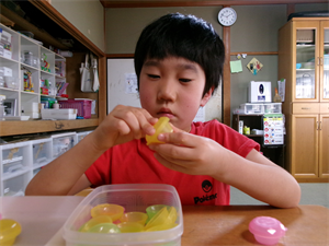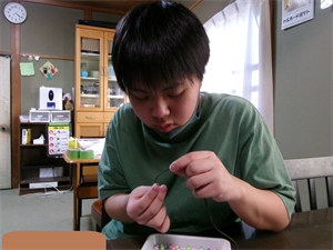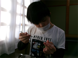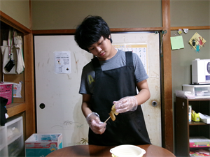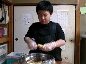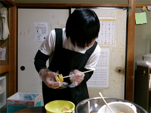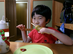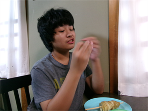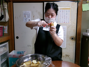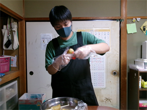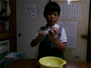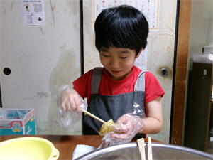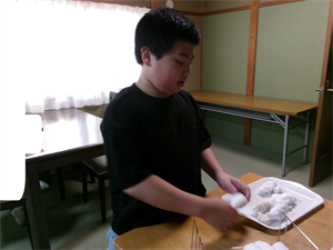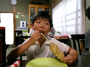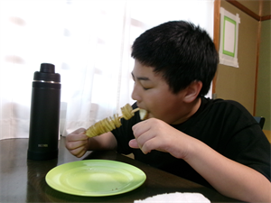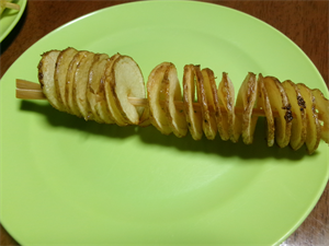 らせん状に切ったじゃがいもに割り箸を刺していきましょう!!