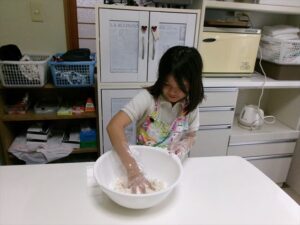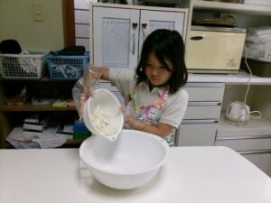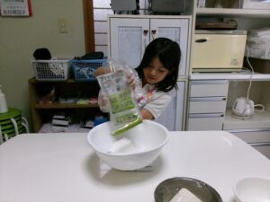 白玉粉と豆腐を計量し、粉っぽさがなくなるまでこねていきます!