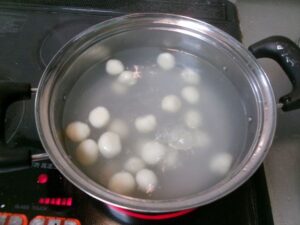 沸騰させたお湯に団子を入れ、茹でたら・・