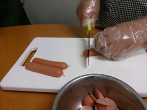 具材のウインナーとちくわをカットして卵を割ります!