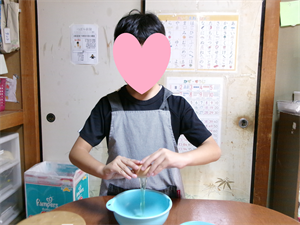 はじめに、ホットケーキミックス、バター、砂糖、牛乳を計量し、卵を割ります!