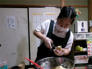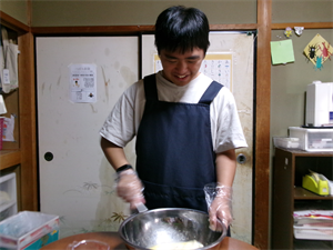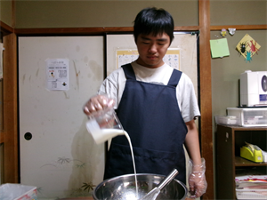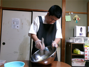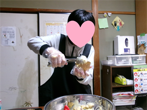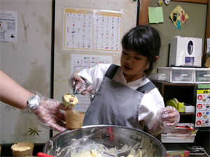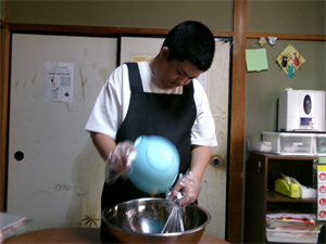 次に、計量した材料等を混ぜ合わせ、事前に準備しておいたさつまいもを加えてさっくりと混ぜていきます!