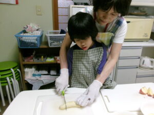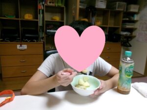 まずはバナナの皮をむいて、バナナとリンゴを一口サイズに切っていきます。
