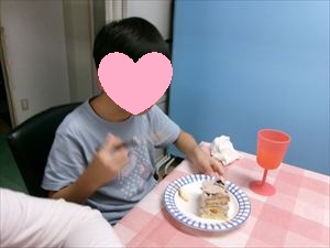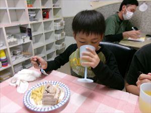 Hくんのご希望のチョコレートケーキとオレンジジュース、オマケのフライドポテトでお祝いします㊗㊗㊗