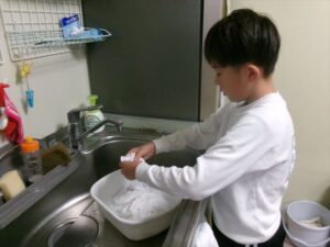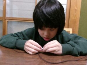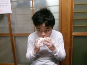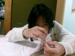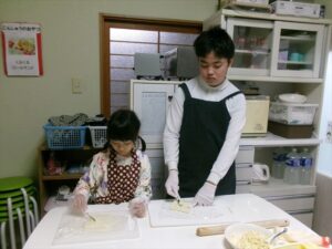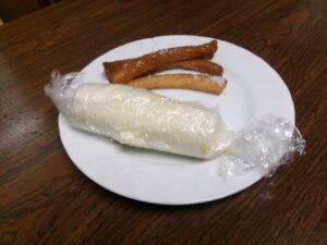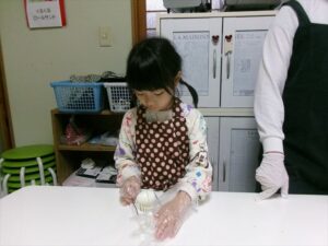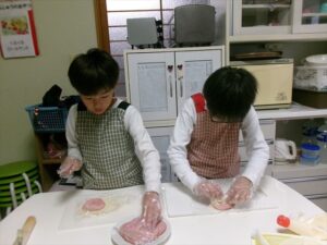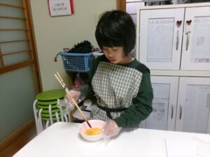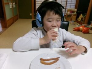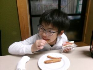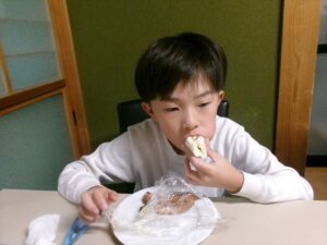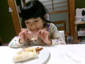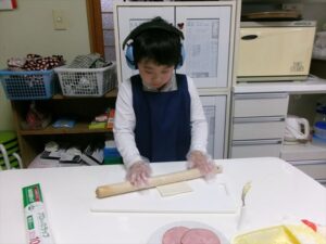 食パンを伸ばし、バターを塗り、ハム・卵をのせ、くるくる~と巻きます。