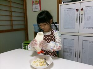 ゆで卵の殻をむき、ゆで卵スライサーで切り、マヨネーズを混ぜ合わせます。