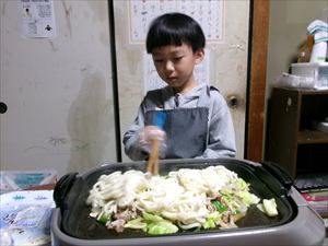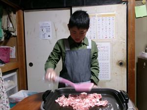 ホットプレートでお肉を焼き、先ほど切った野菜を入れてよく炒めます!