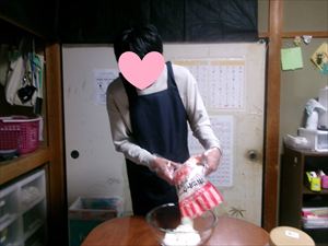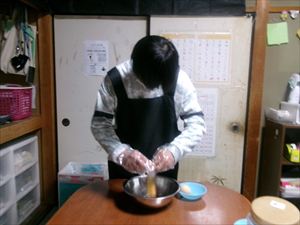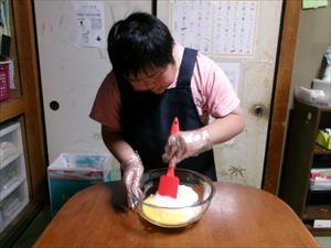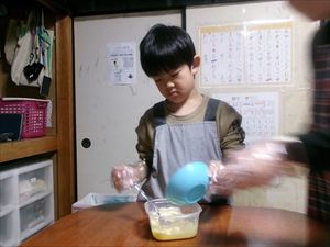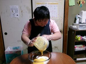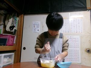 次に、たまごを割り、計量をした材料を順番に入れて生地を作ります✋