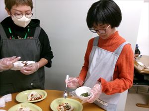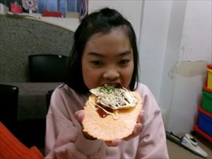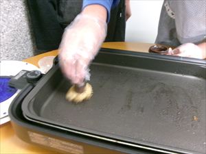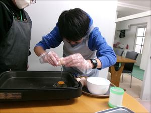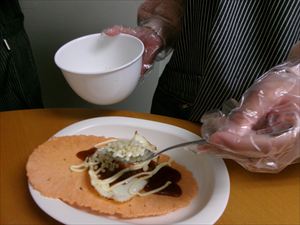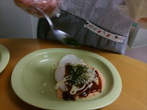 目玉焼き、天かす、ソース、マヨネーズ、青のりをたこせんにトッピングします。