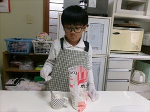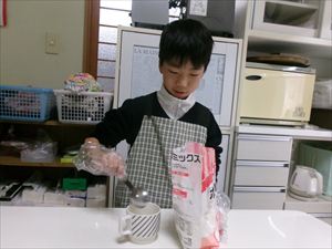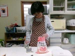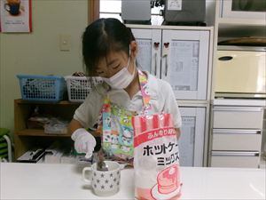 まずはホットケーキミックスを大さじ5杯マグカップに入れていきます。