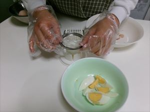 ゆで卵の殻をむいて、スライサー専用器で卵を4等分にしていきます🥚