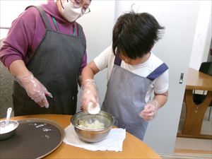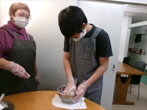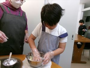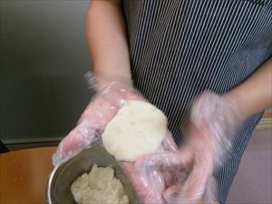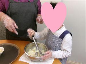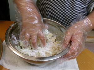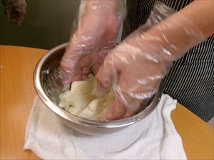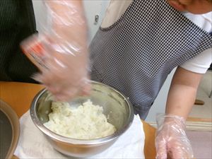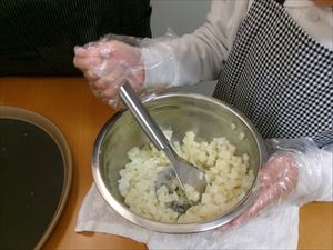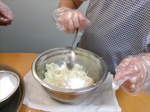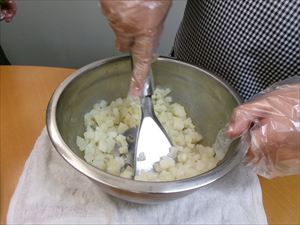 温まったじゃがいもを半分つぶして塩、コショウ、片栗粉を入れて混ぜます。