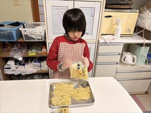 次はおやつ作りです!今週のおやつは「どりーむラーメン」です🍜
