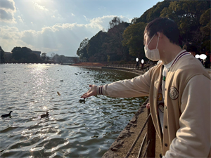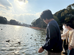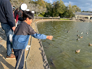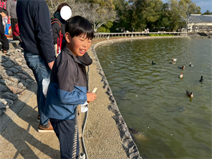 では帰る前に池にいる鴨さんと鯉さんにパンをあげました~~(*´▽`*)
