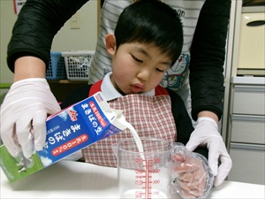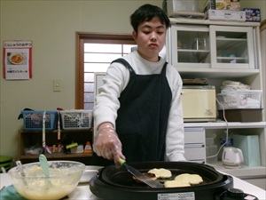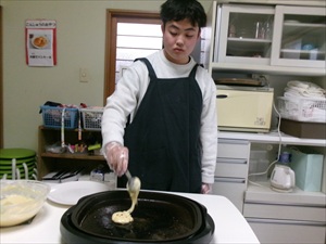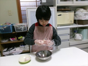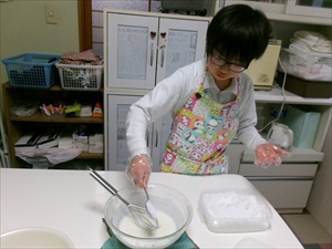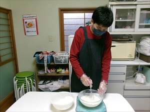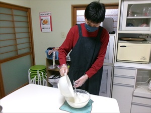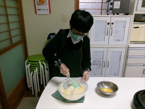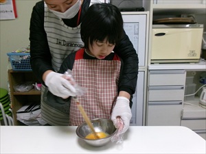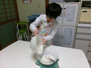 材料を計量したり、卵を割ったりして・・後は混ぜて焼いていきすよ~