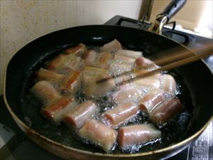 半分にカットし、多めの油で揚げ焼きにしたら完成です。