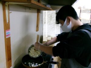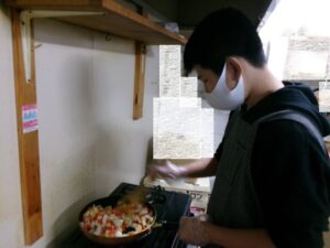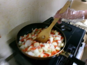 具材が切れたらフライパンで炒めます!