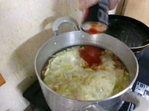 水にコンソメを入れてトマト缶と炒めた野菜を煮込みます💕
