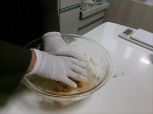 きな粉を計量して・・水飴を入れて・・混ぜます!!