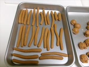 ひとかたまりになったら、一口大にちぎって丸めて伸ばしていきます!!