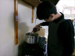 水とコンソメ、トマト缶を入れて煮込みます。塩コショウで味を調えます。