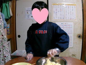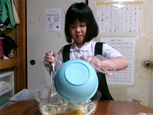 次に、卵を割って計量をしておいた材料と一緒に混ぜて生地を作ります!