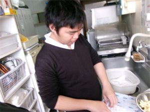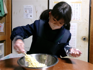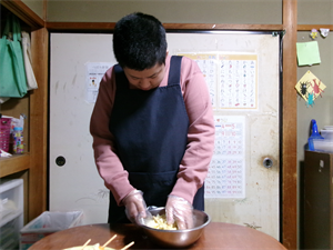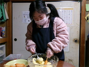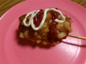 続いて、生地が出来たらウインナーに生地をくぐらせ、刻んでおいたポテトを付けて油で揚げましょう!