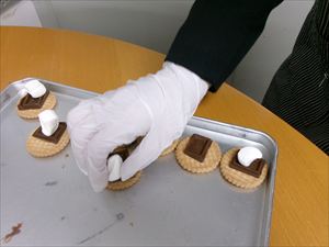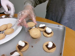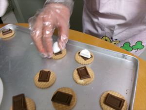 ビスケットの上にチョコレートとマシュマロを乗せ、
