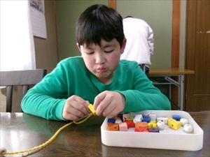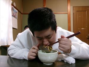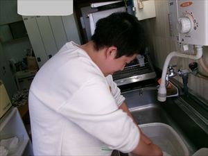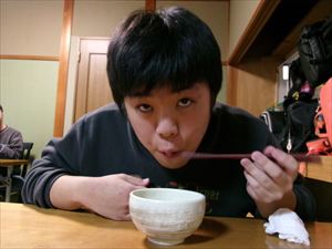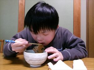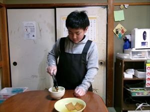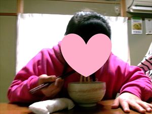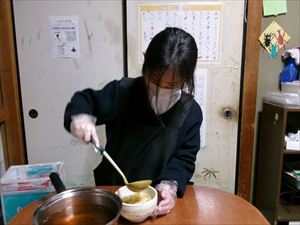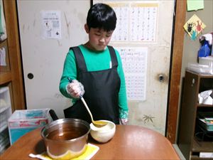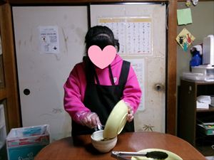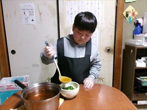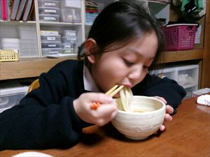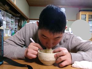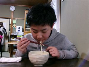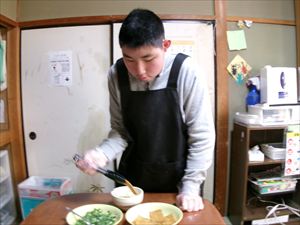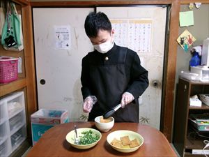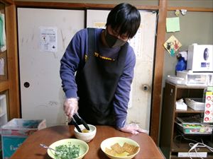 茹で上がったうどんに、1人ずつ、あげ、ねぎをトッピングします✋
