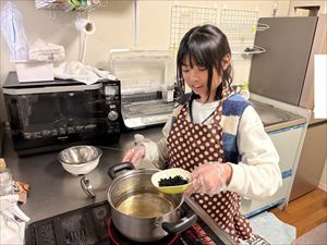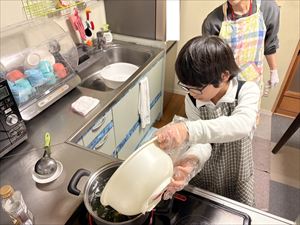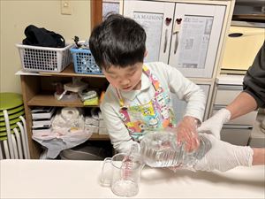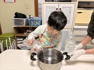 まずは水と白だし、わかめの計量をお願いしまーす!