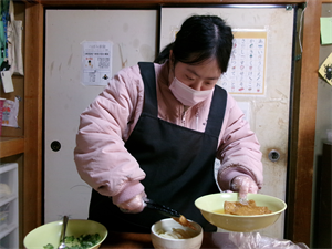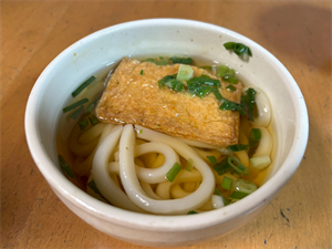 茹で上がったうどんの上に「あげ・ねぎ」をトッピングしていきます😊