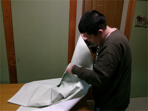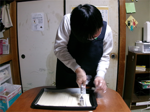 長細く切ったパイシートにフォークで穴を開けて、端と端を持ってねじっていきます!