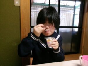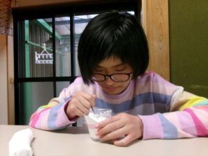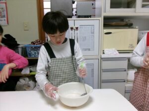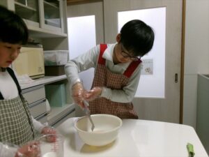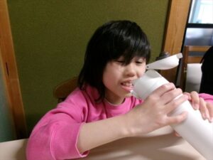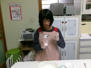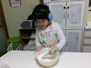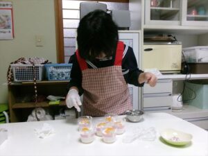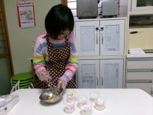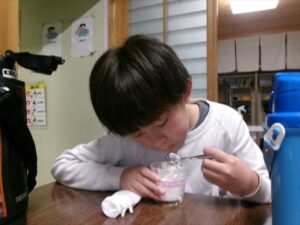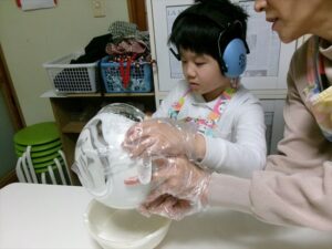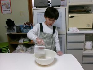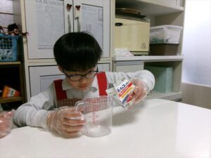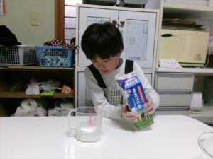 牛乳を計量し、フルーチェと混ぜ合わせます。