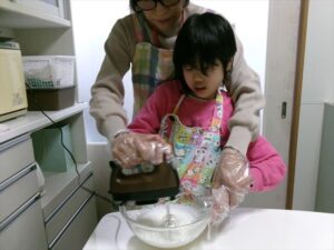 生クリームをハンドミキサーで泡立てます。