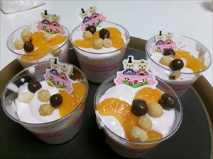 出来上がったムースをカップに分けていき、上にみかん・あられをトッピングしたら・・