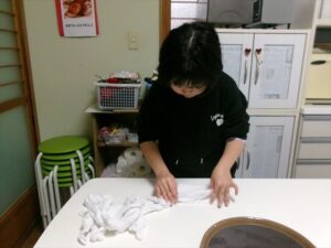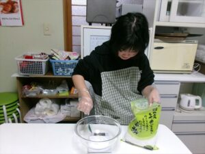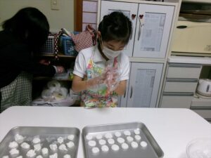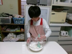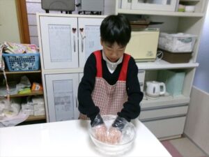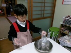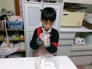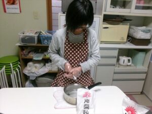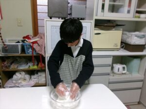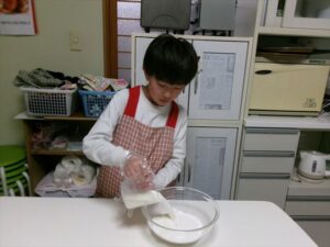 白玉粉に牛乳を少しずつ加え、耳たぶくらいのやわらかさになるまで手でよく練ります。