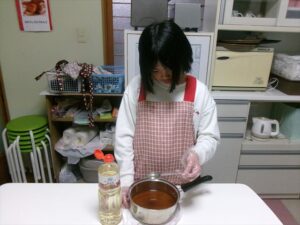 しょうゆ・みりん・砂糖・片栗粉を入れよく混ぜ、水を加え、火にかけ、みたらしを作ります。