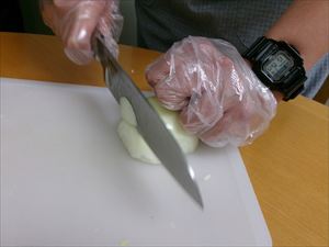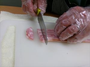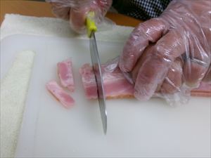 ベーコンやジャガイモ、タマネギをカットします。