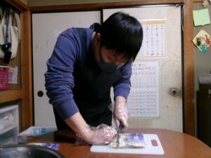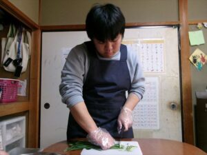 はじめに、うどんとニラを包丁で切ります!