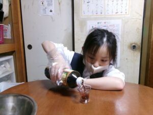 次に、しょうゆとごま油の計量をしたら卵を割ります!