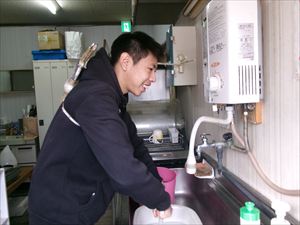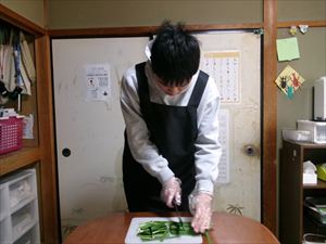 はじめに、うどんとニラを包丁で切ります!