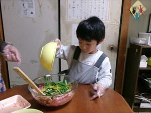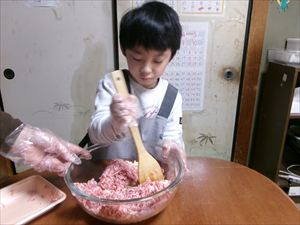 続いて、ボウルにひき肉、切った材料としょうゆとニラを入れてよく混ぜます🎵