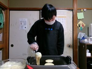 ダマがなくなるまでしっかり混ぜたら、熱したホットプレートで両面をきつね色になるまで焼いていきます!