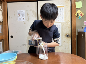 はじめに、ホットケーキミックス、牛乳を計量し、卵を割ります🥚🥛