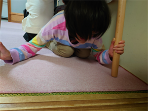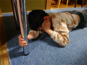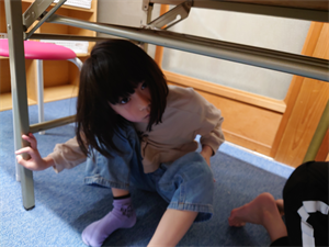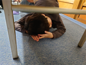 机の下にしっかりと入り、頭を守り、机の脚を押さえています!